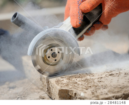 Worker with cutting ceramic tile on wet saw machine using circular diamond blade