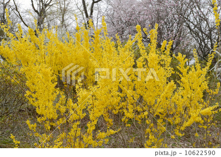 レンギョウ(連翹)の黄色い花のある風景