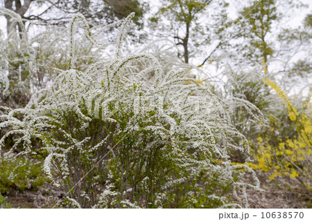 白く溢れる雪柳に黄金色のレンギョウが絡み合う春光
