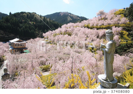 長野県 龍谷寺の枝垂れ桜と石像