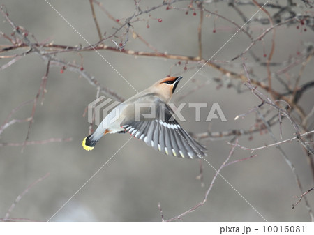 ピラカンサの実を咥えて羽ばたくヒレンジャク