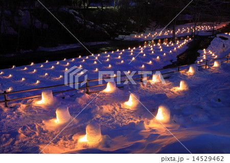 雪景色の大内宿 雪まつり 雪灯篭のある街並み 福島県下郷町