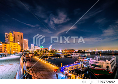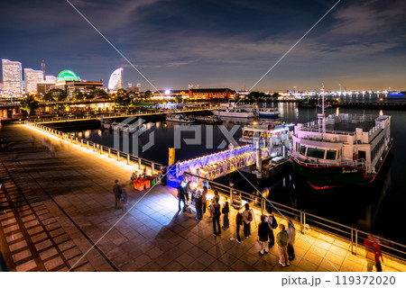 日本の横浜都市景観 横浜・ピア象の鼻観光船乗り場のゆめはまやみなとみらいの夜景を望む=10月11日