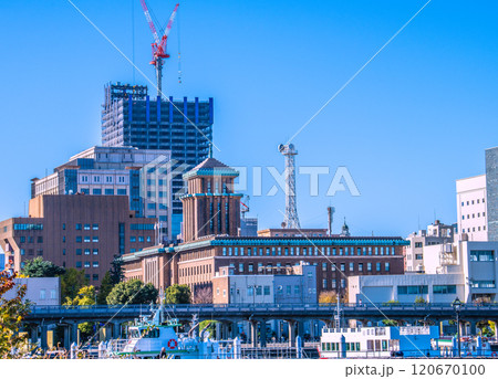 日本の横浜都市景観 歩道橋のある街。神奈川県庁・キングの塔や税関、パシフィコ横浜などを望む=28日