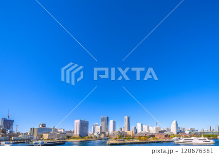 日本の横浜都市景観 歩道橋のある街。横浜税関や観光船、大観覧車、パシフィコ横浜などを望む=28日
