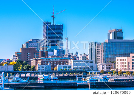 日本の横浜都市景観 歩道橋のある街。関内駅前の再開発や県庁や観光船、税関、大観覧車などを望む=28日