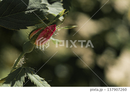 A young pink rosehip flower bud starting to open on a green bush in the garden during spring