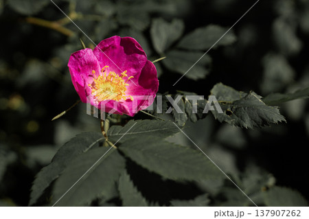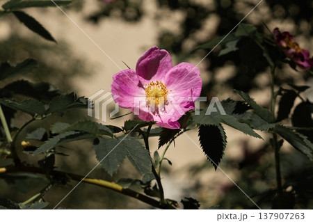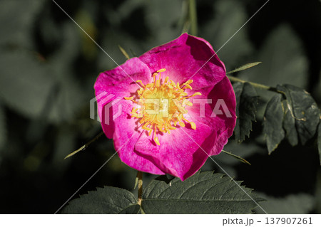 Rosa rugosa or Beach rose bright pink flower and leaves