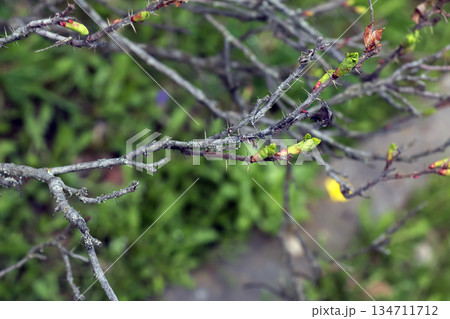 A close-up ofbranch of Japanese rose Rosa rugosa with several emerging leaves in early spring. Early spring. Blurred background