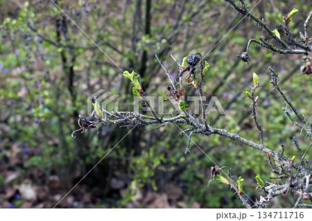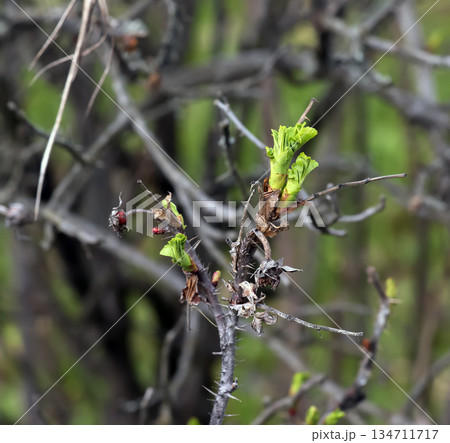 Close-up ofbranch of Japanese rose Rosa rugosa with several emerging leaves in an early spring. Early spring. Blurred background.