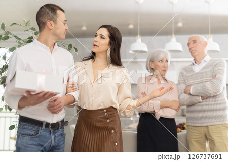 Smiling young couple leaving the house while discontented senior parents standing behind