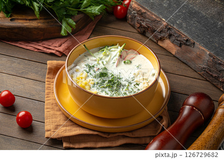Homemade Traditional Russian soup Solyanka with meat, sausages, vegetables, pickles and olives with lemon in ceramic pot with wooden spoon on dark wooden background,