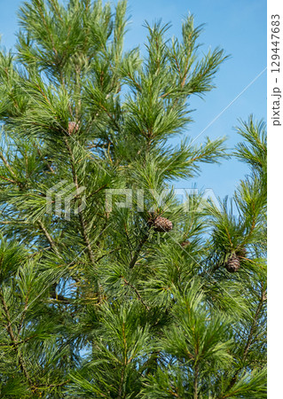 Green pine tree branches with long needles and brown cones against a clear blue sky.