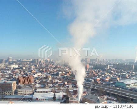 Winter town. Frosty sunny day in the city. Snow on the streets and smoke from the boiler rises. Frost and sun, a wonderful day