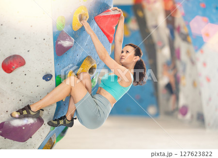 Middle-aged woman climbing on artificial rock wall in rock-climbing gym