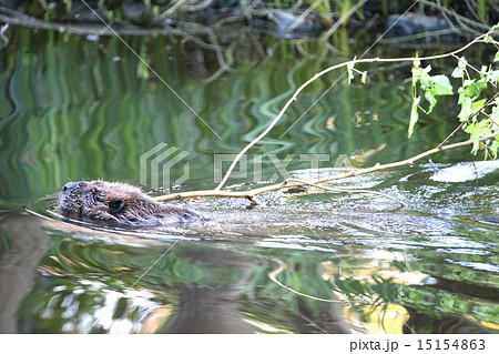 小枝を口でくわえて泳ぐビーバーーBeaver holding branch and swimming