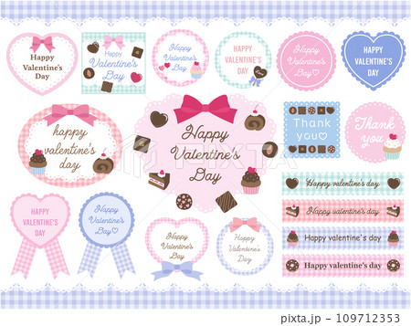 バレンタインのかわいいフレームセット。リボン、ギンガム、ハート、お菓子、プレゼント
