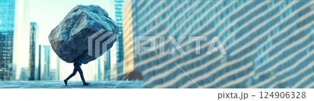 A stressed businessman carrying a large stone on his back while standing in an urban setting, symbolizing the heavy burden of work, taxes, and modern life struggles. Copy space