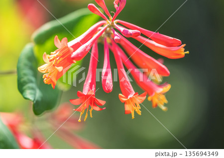 Lonicera sempervirens flowers, common names coral honeysuckle, trumpet honeysuckle, or scarlet honeysuckle, in bloom.