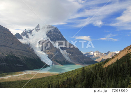 トレイル沿いから眺めるカナディアンロッキー最高峰ロブソン山とバーグ湖