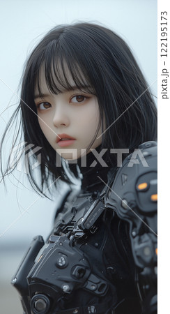 戦闘服を着た少女 後ろに立っている大きなロボット「AI生成画像」