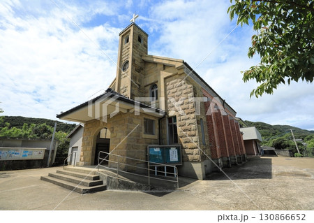 快晴の夏空と緑豊かなカトリック紐差教会(日本 長崎県平戸市)