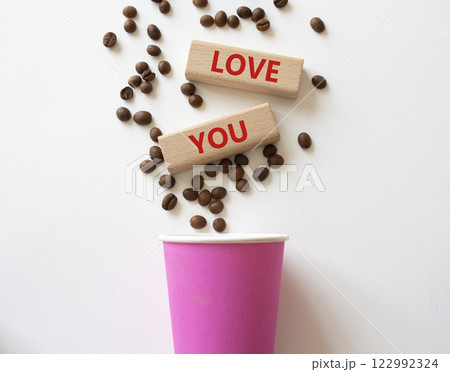 Love you symbol. Concept word Love you on wooden blocks. Beautiful white background with coffee cup. Business and Love you concept. Copy space