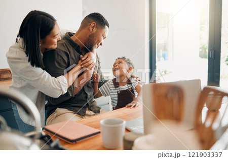 Family, bonding and playing with their happy little boy while laughing, teasing and talking at home with flair. Loving wife and son hugging dad while showing him love and affection on fathers day