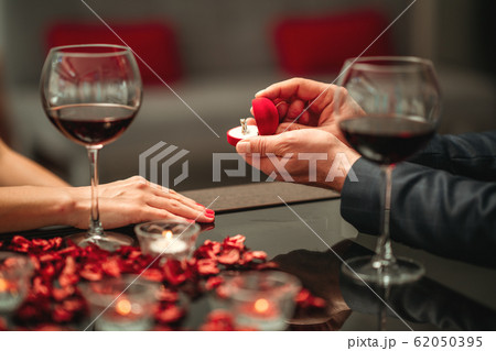 A couple having a romantic dinner and a suprise proposal in a elegance restaurant with beautiful decoration. Romance and Valentines day concept.