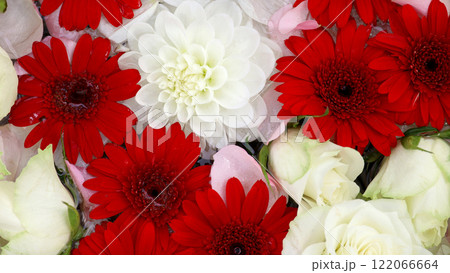 壁面を飾るバラのフラワーアレンジメントにクローズアップした背景素材用写真
