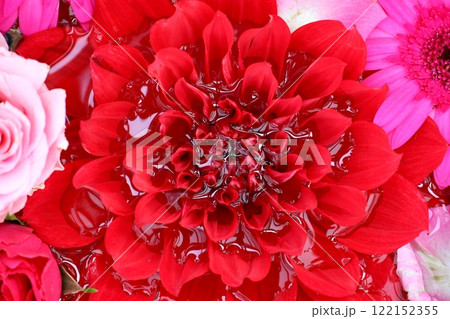 水に浮くカラフルな花を真俯瞰で撮影した背景素材用写真