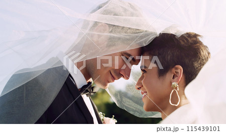 Wedding, veil and couple with forehead touching for marriage, commitment or ceremony celebration. Event, save the date and romantic man with woman hug for relationship, love milestone or trust