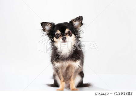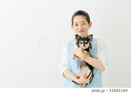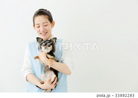 愛犬のトリミングをする飼い主の女性 ロングコートチワワ