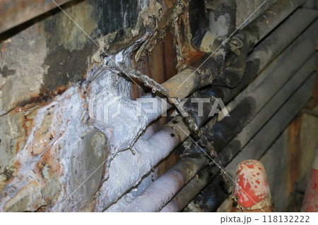 トンネルの壁から噴き出す地下水 トンネル内の漏水