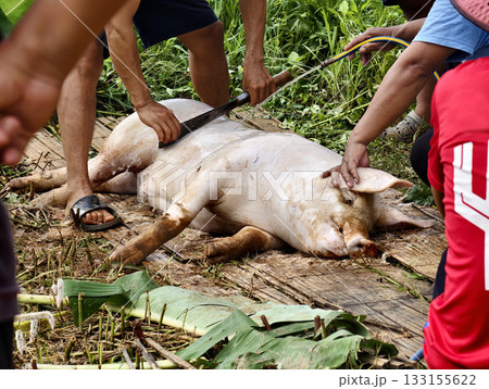 Villagers preparing a pig by scraping hair and cleaning it before butchering during a traditional countryside event.