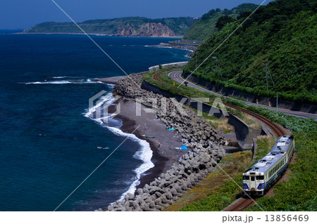 日本海の海岸線沿いを走る五能線のローカル列車