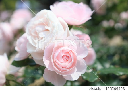薔薇園にピンク色のグラデーションが綺麗な薔薇の花が咲いています
