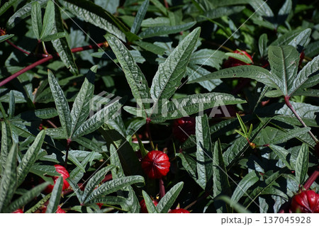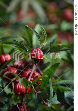 ローゼルの葉と赤色の果実