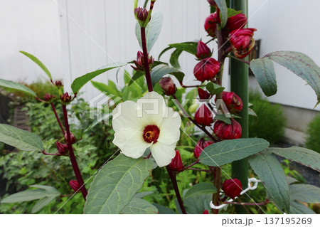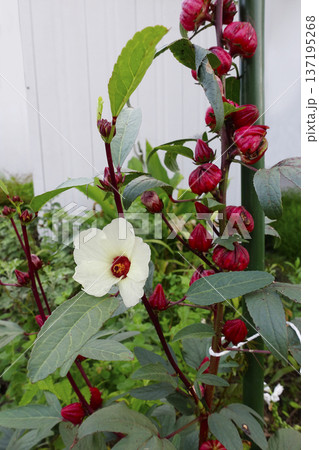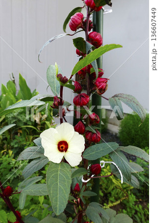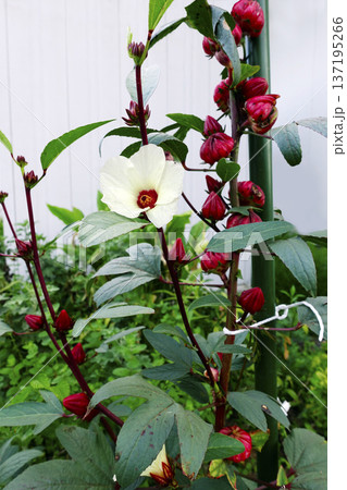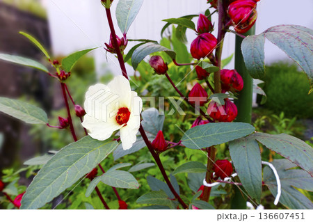 10月秋に咲いたローゼルの白い花と赤い果実