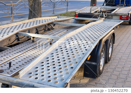 Large transport trailer with perforated surface and ramps parked in a city environment, showcasing its sturdy design under clear sky