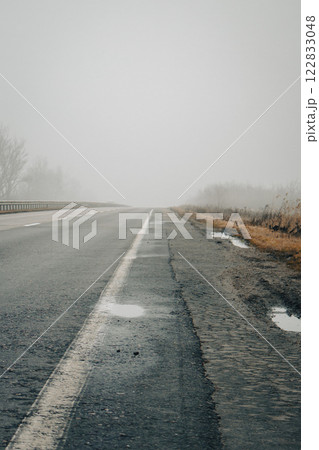 Empty highway in the fog. Bad weather on the road. Road on foggy day in perspective with copy space. Driving conditions concept. Ghostly misty road. Caution and danger on the road. Moody weather