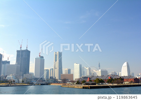 日本の横浜都市景観 10月。横浜ランドマークタワーや夕日、みなとみらいの街を望む=13日
