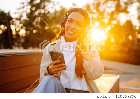 Young woman listens to music, audiobook or podcast. Communication in social networks. Lifestyle.