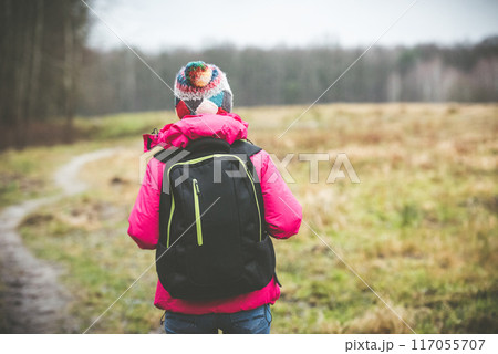 Rear view tourist woman with backpack walking on forest eco path on autumn cold day in warm clothes