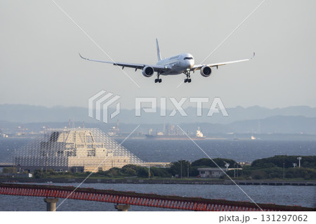 夕暮れの羽田空港 着陸中の飛行機 東京都大田区