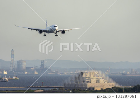 夕暮れの羽田空港 着陸中の飛行機 東京都大田区