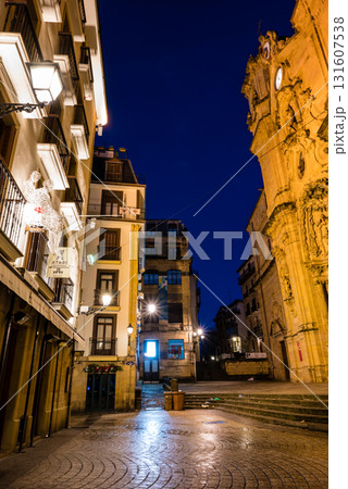 スペインのサンセバスチャンの夜明け前の旧市街 人気のない石畳と街燈と歴史的な建物