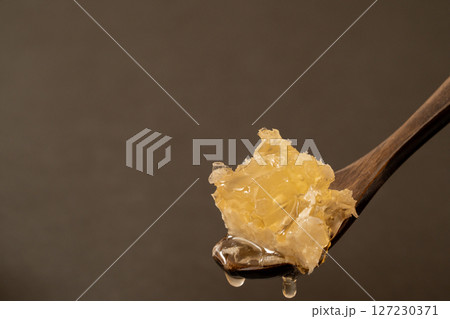 木製スプーンに乗った巣蜜のアップ写真