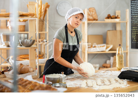 Young baker girl is standing near work table in kitchen, working with dough