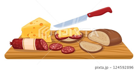 Wooden cutting board with cut products. Sandwich cooking. Slicing cheese and sausage. Bread pieces. Food preparation. Baked loaf or baguette chopping with knife. Vector culinary objects